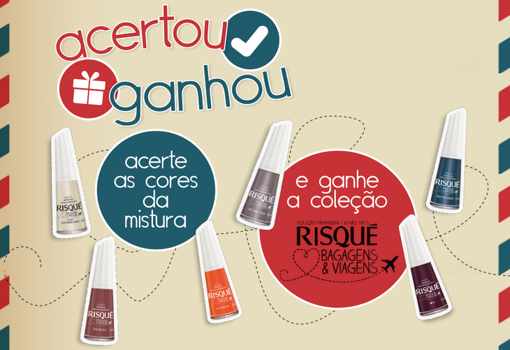 As Lojas Rede está com uma super promoção. Você participa de um game da campanha, e se acertar as cores ganha um super KIT contendo 6 esmaltes.O KIT Risqué linhas Bagagens & Viagens contém as cores: O Rio Continua Lindo, Ciao Milão, Eu amo Nova Iorque, Are Baba, Índia, Ora, pois Lisboa e Viva o México. Se você for de BH ou região metropolitana deverá retirar o KIT fisicamente e se for de outro lugar será enviado pelos Correios gratuitamente. Participe!